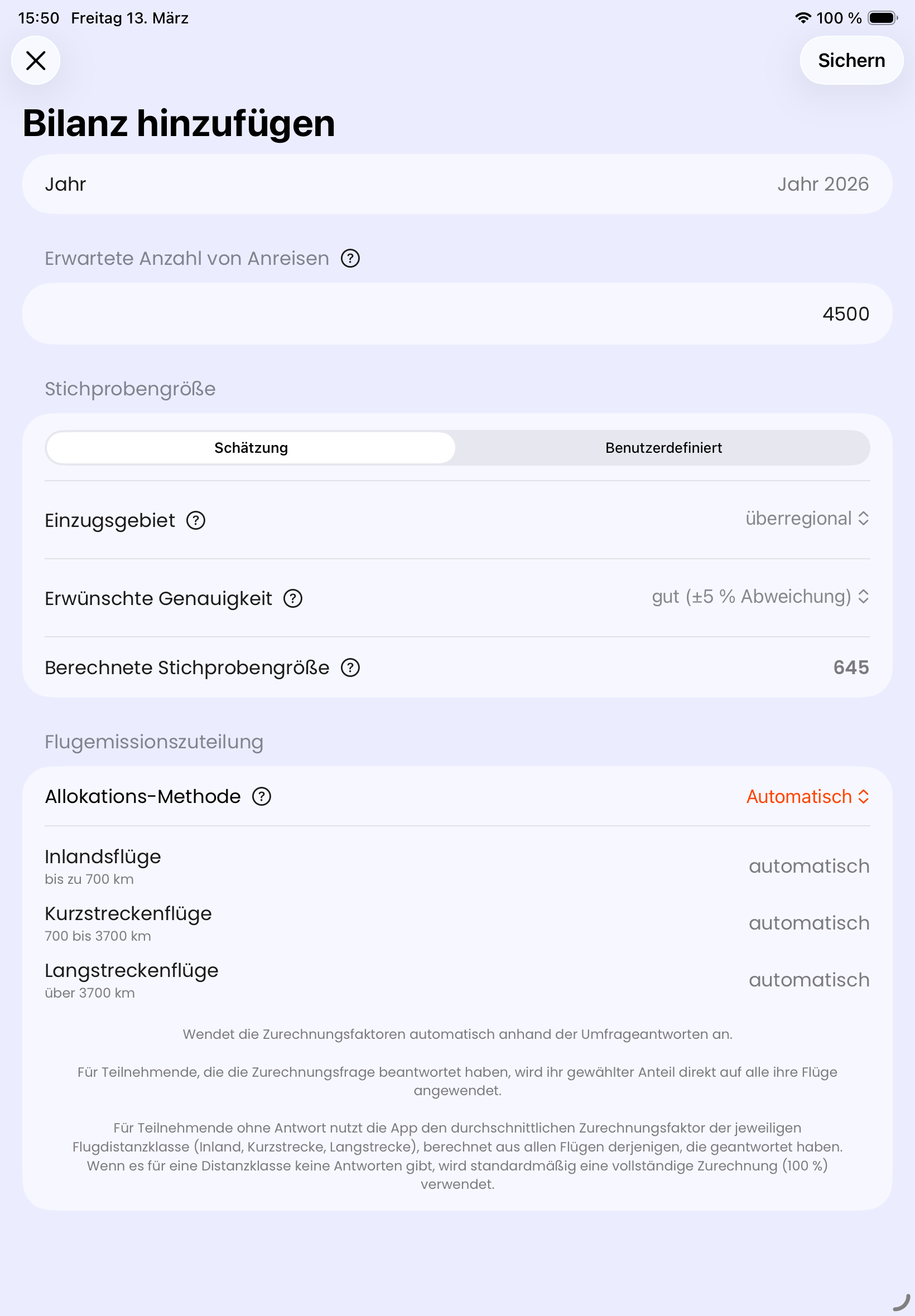Vollständig: 100 % der Flugemissionen werden der Bilanz zugeschriebenAutomatischDie Flugemissionen werden basierend auf einer Zusatzfrage automatisch ermittelt, die du in der erweiterten Umfrage stellen kannst.Benutzerdefiniert: Du gibst selbst einen Wert ein. Du kannst jeweils für die Flugdistanzklassen Inlandsflug, Kurzstreckenflug, und Langstreckenflug einen eigenen Faktor hinterlegen (oder überall denselben eintragen).