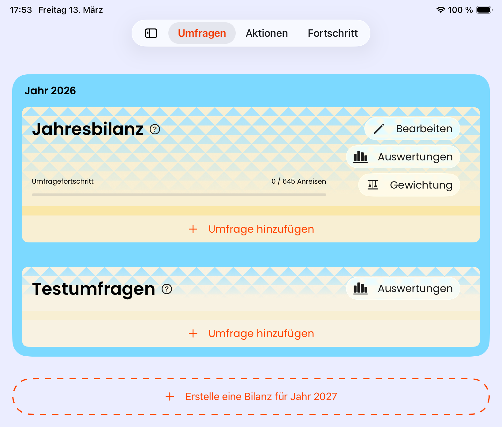 Ein Jahresbilanz-Panel ist in zwei Bereiche geteilt: Jahresbilanz und Testumfragen.