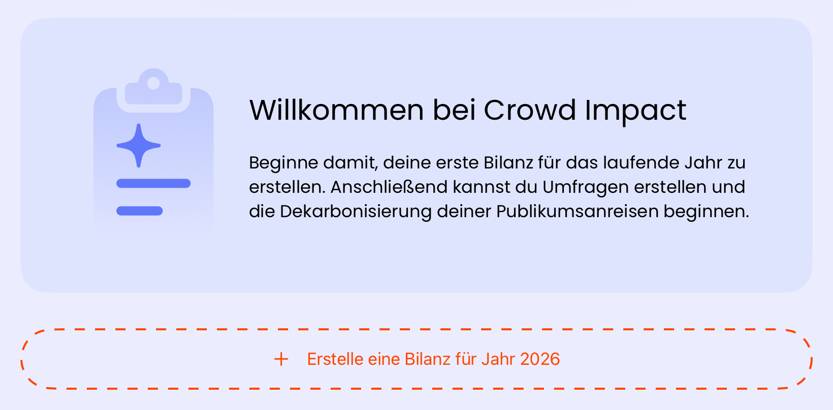 Erstellen wir jetzt deine erste Jahresbilanz. Sie ist das Dokument, das die Publikumsmobilität all deiner Veranstaltungen bündelt, die Gesamtemissionen der Stichprobe auf eine Grundgesamtheit – also die Anreisen all deiner Gäste des ganzen Jahres – hochrechnet und detaillierte Auswertungen anzeigen lassen kann. Klicke dafür in der Umfragen-Ansicht auf "Erstelle eine Bilanz für Jahr …".
