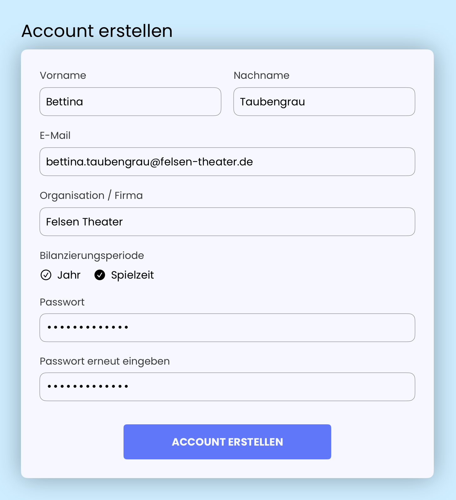 Erstelle zunächste einen Account mit deiner Arbeits-E-Mail-Adresse. Dort gibst du auch ein paar Informationen zu deiner Organisation an: Den Namen und die Bilanzierungsperiode. Der Name wird später ggf. den Umfrageteilnehmenden sichtbar (in der Online-Umfrage). Die Bilanzierungsperiode bestimmt, ob die Jahresbilanz zum Beispiel "Jahr 2027" heißt oder "Spielzeit 2026/2027".